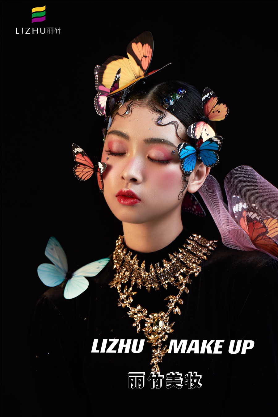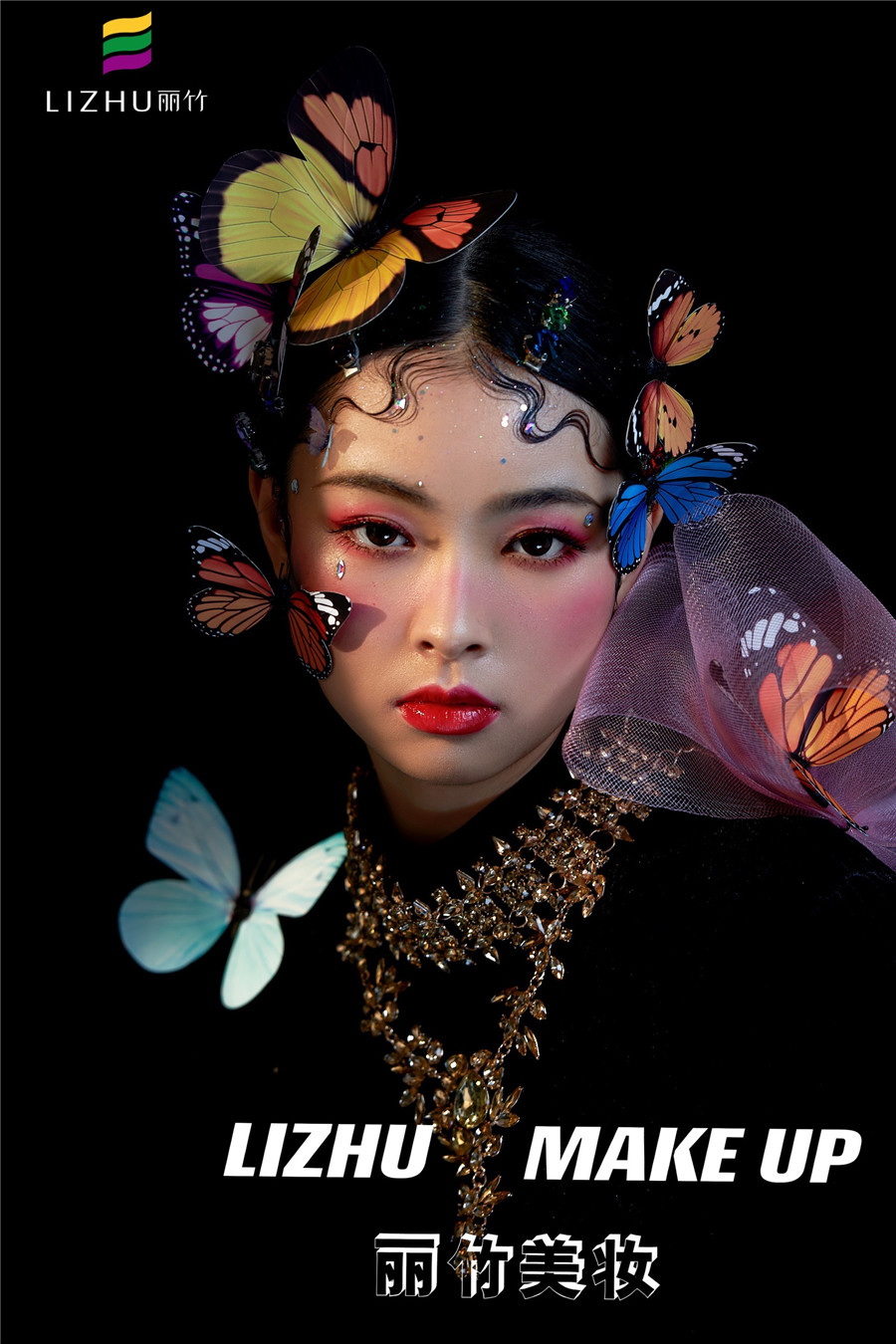 麗竹化妝學(xué)校作品---唯美蝴蝶妝容:肩頭兩鬢和眼前額頭,被五彩斑斕的蝴蝶點(diǎn)綴,強(qiáng)烈的黑色背景搭配亮眼色差,產(chǎn)生了很強(qiáng)的視覺效果,讓人過目不忘之余,更寓意破繭成蝶涅槃重生的狀態(tài)。