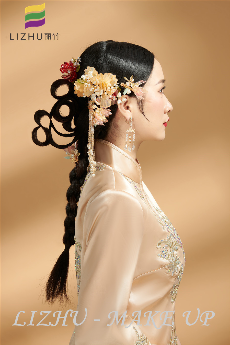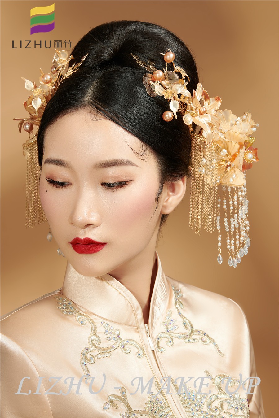 廣西正規(guī)彩妝培訓(xùn)、廣西排名前十彩妝學(xué)校作品---新中式新娘造型:飽滿(mǎn)的低卷筒盤(pán)發(fā),佩戴鎏金玉釵玉簟點(diǎn)綴,女子的優(yōu)雅古典、大方完全展現(xiàn),打造古香古色韻味十足的新中式新娘。廣西彩妝學(xué)校十大名校-麗竹學(xué)校常年開(kāi)設(shè)廣西彩妝培訓(xùn)班,歡迎大家進(jìn)班參觀試聽(tīng)。