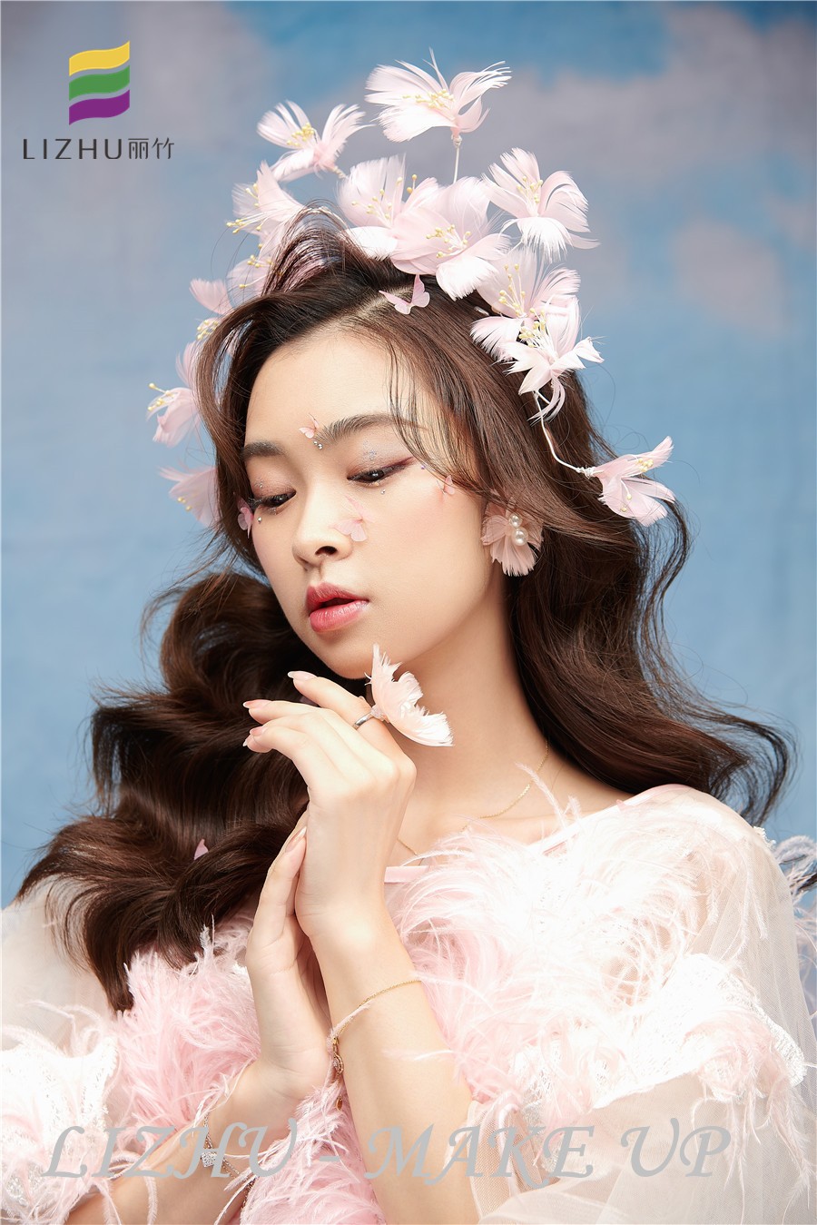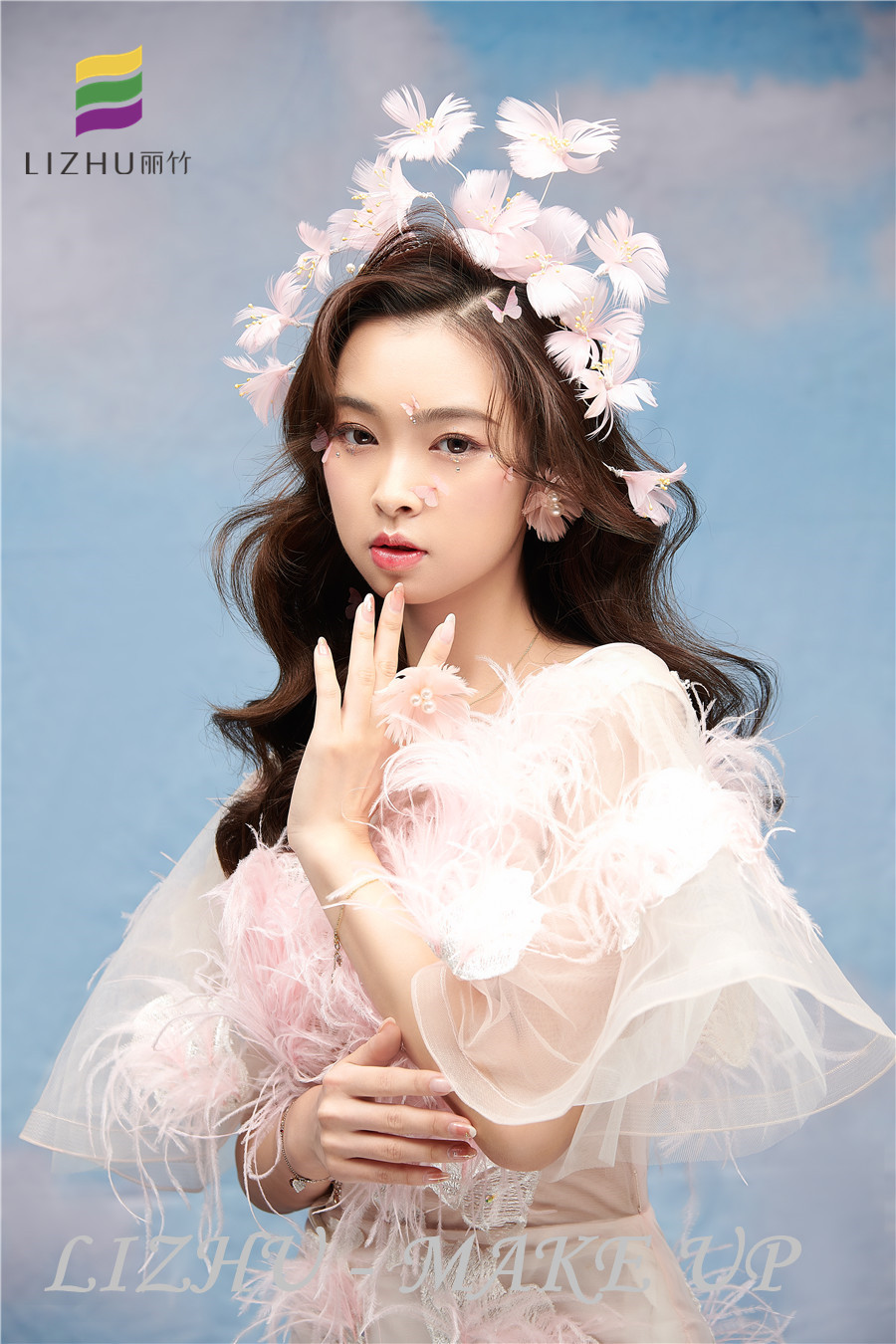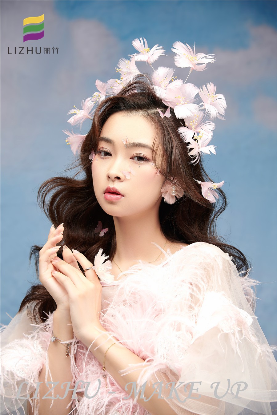 南寧化妝職業(yè)培訓(xùn)學(xué)校、南寧化妝培訓(xùn)學(xué)校排名、南寧化妝學(xué)校十大品牌分享:優(yōu)雅清新的披發(fā)造型,搭配粉色羽毛頭飾與紗群,粉色蝴蝶視頻點(diǎn)綴妝容,整體甜美又仙氣飄飄。