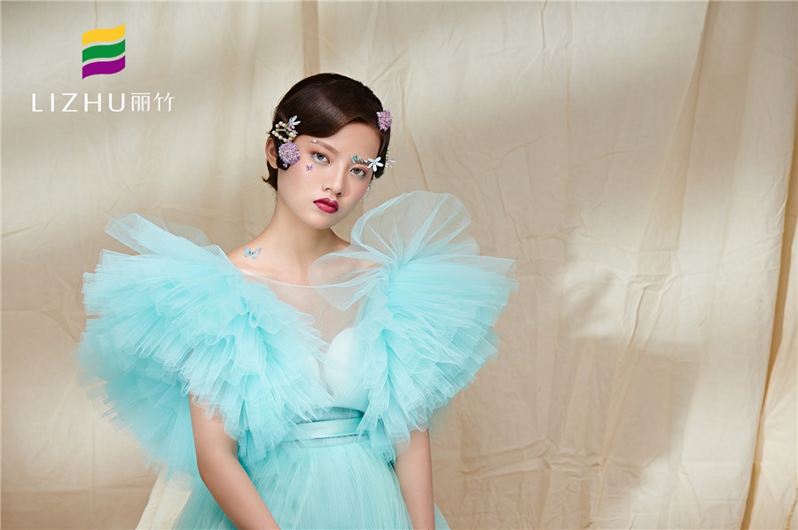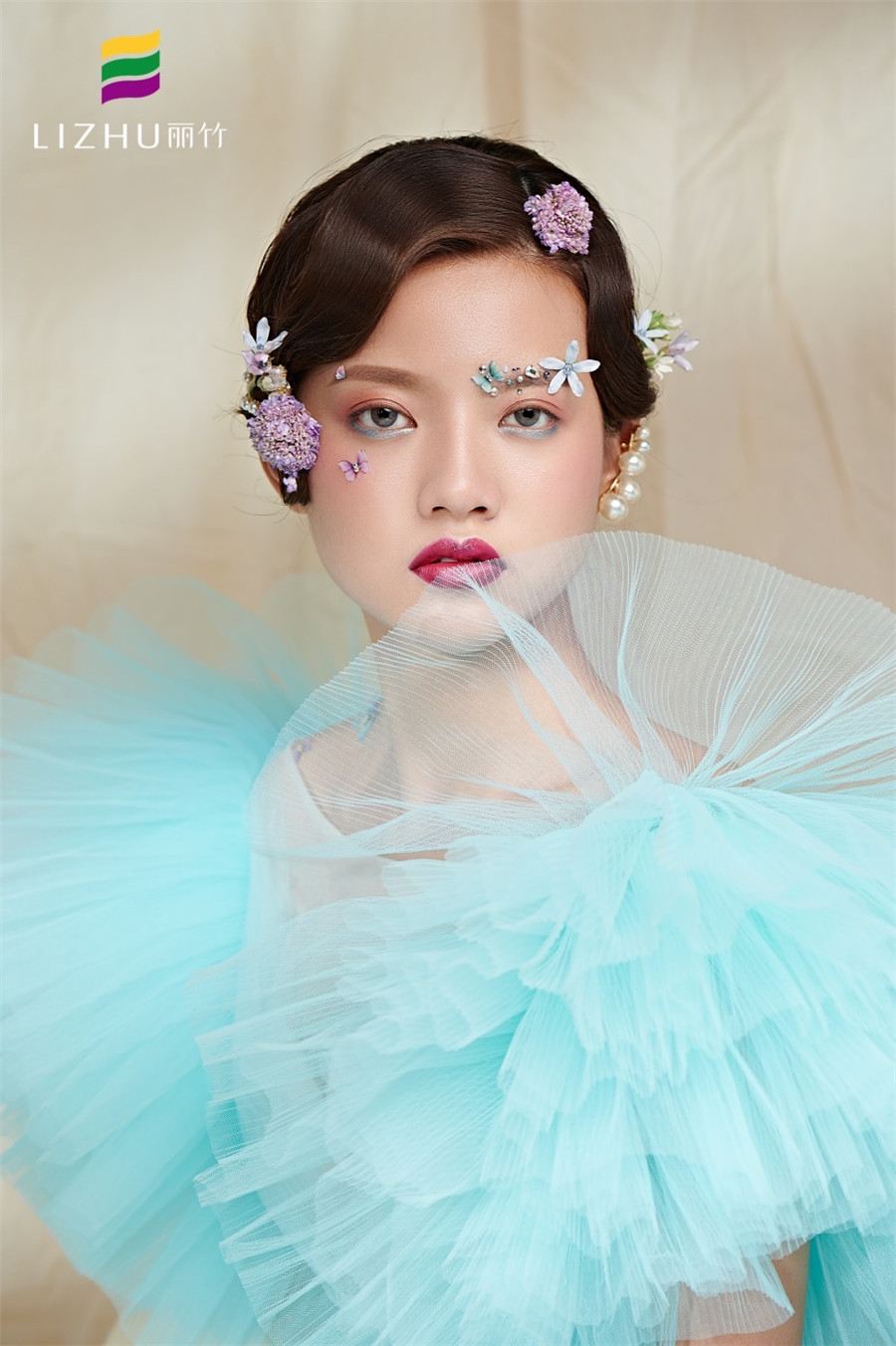 麗竹學(xué)校彩妝作品---流光·化蝶 ·夢(mèng)幻:藍(lán)色輕紗加上妝容花朵點(diǎn)綴,頭飾與發(fā)型的完美搭配,流淌出輕柔舒緩之美,簡(jiǎn)約自然的情緒態(tài)度。