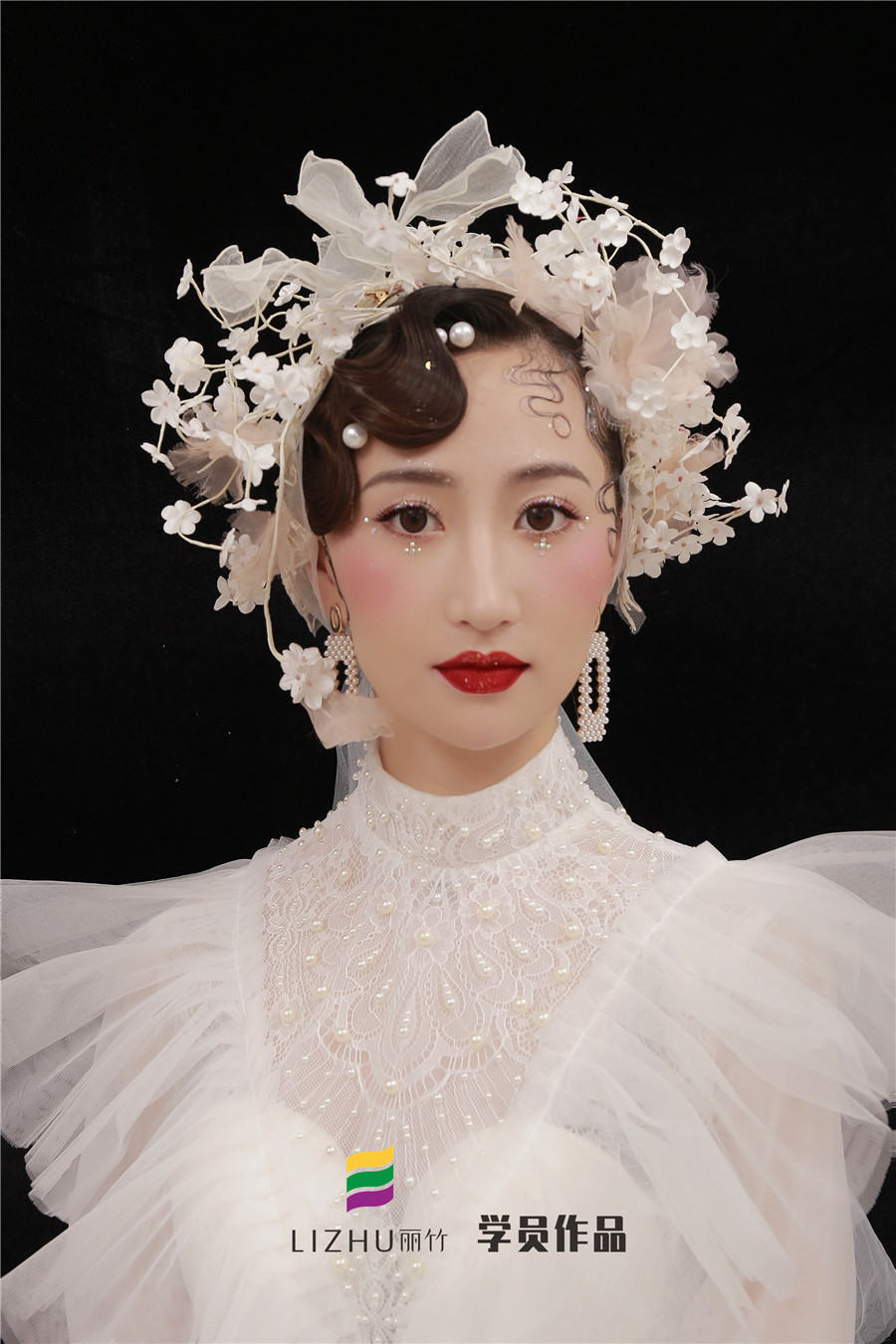 采用復(fù)古手推波和濕推手法,搭配白色頭紗和珍珠的點(diǎn)綴,突顯干凈、純潔、珍貴的氣質(zhì) 。再加以細(xì)膩珠光粉眼影和閃粉表達(dá)少女追求美好和永恒的情感,營(yíng)造看似簡(jiǎn)約而不失單調(diào),復(fù)古卻不守舊的時(shí)尚經(jīng)典妝容。