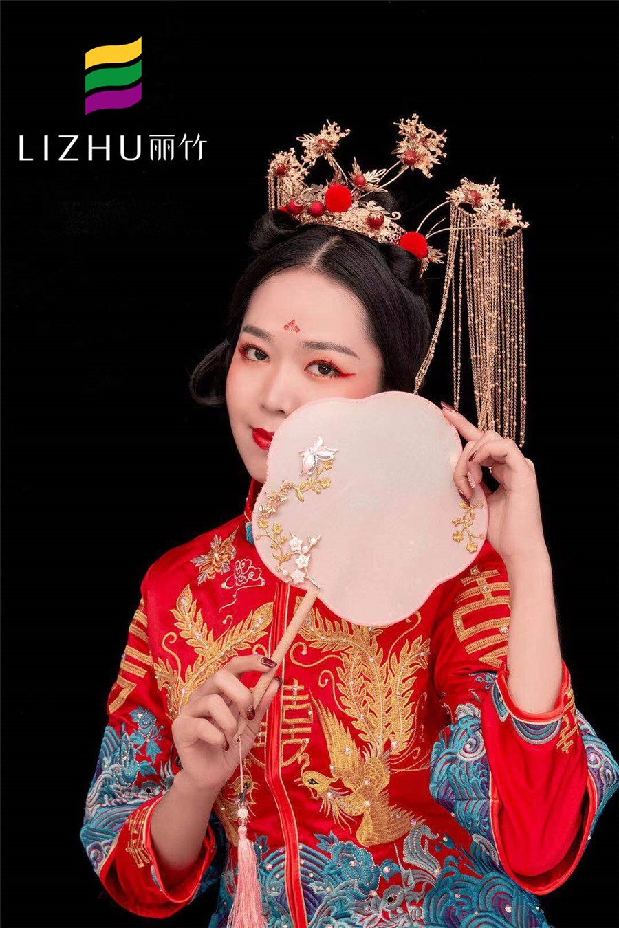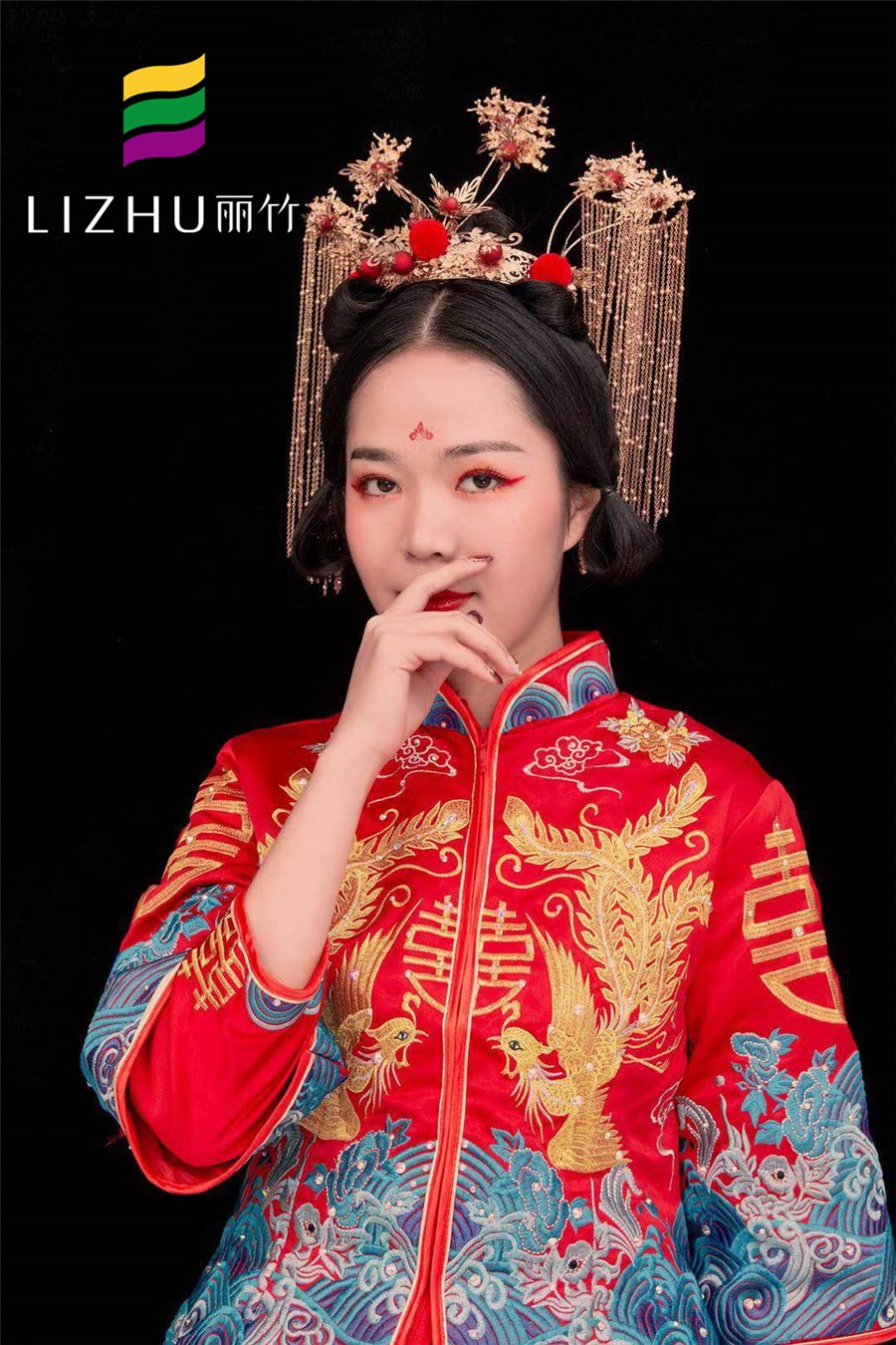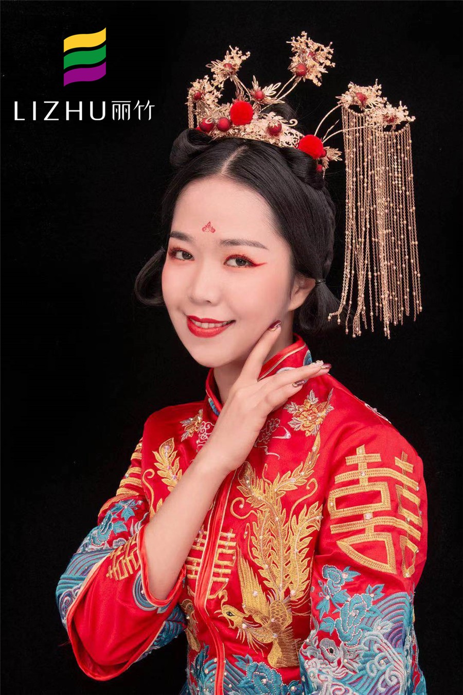 麗竹學校彩妝作品:中式秀禾新娘造型:端莊喜慶大氣的紅色,配上雍容華貴的金絲秀禾,典雅的妝容更顯新娘儀態(tài)萬千,散發(fā)出濃濃的東方魅力。