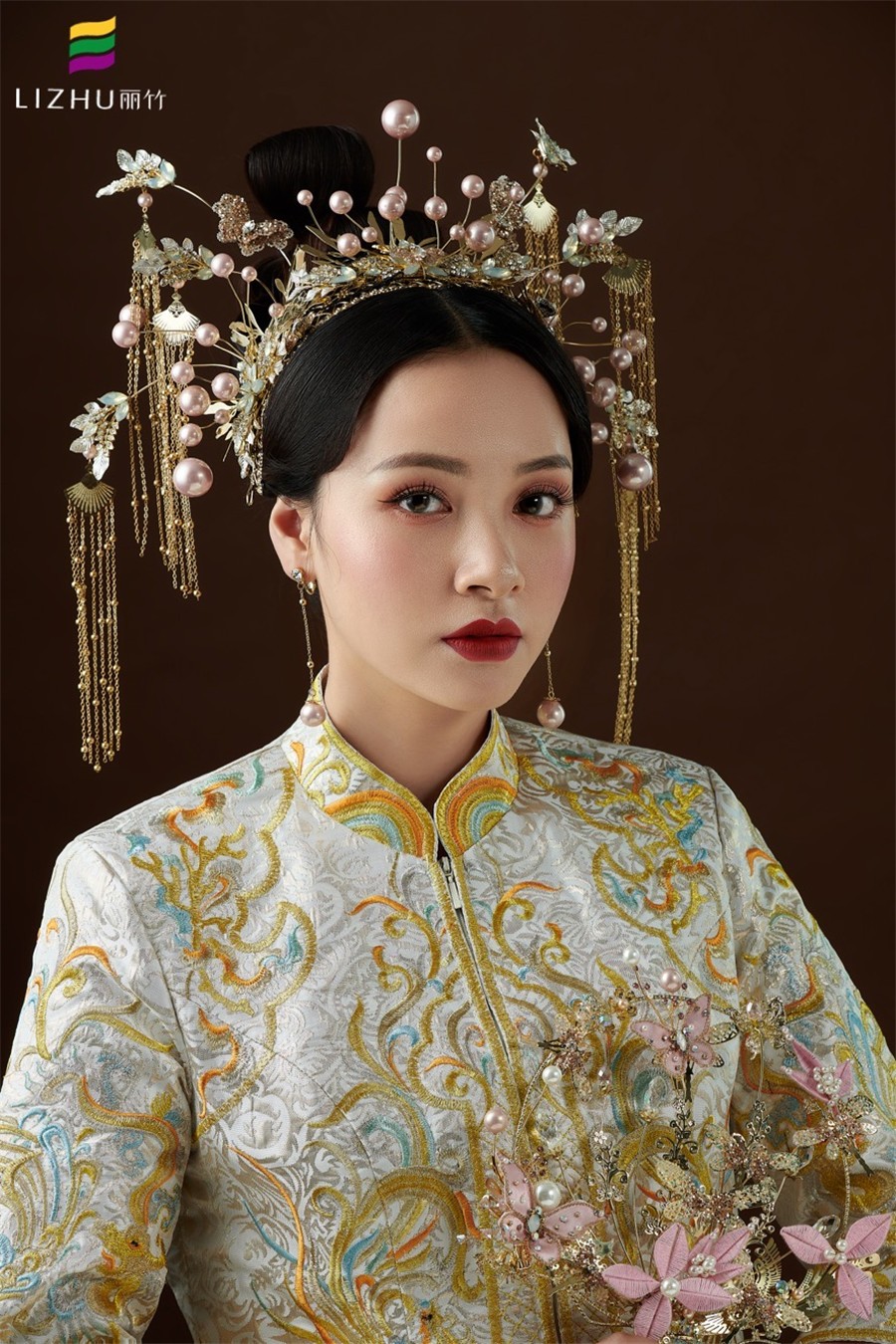 麗竹學校作品:中式秀禾新娘妝容造型:初見是始料未及的心動,沁人心扉的一抹金色,雍容華貴直擊眼球,恬雅流蘇微晃動人,頗有小家碧玉的感覺。