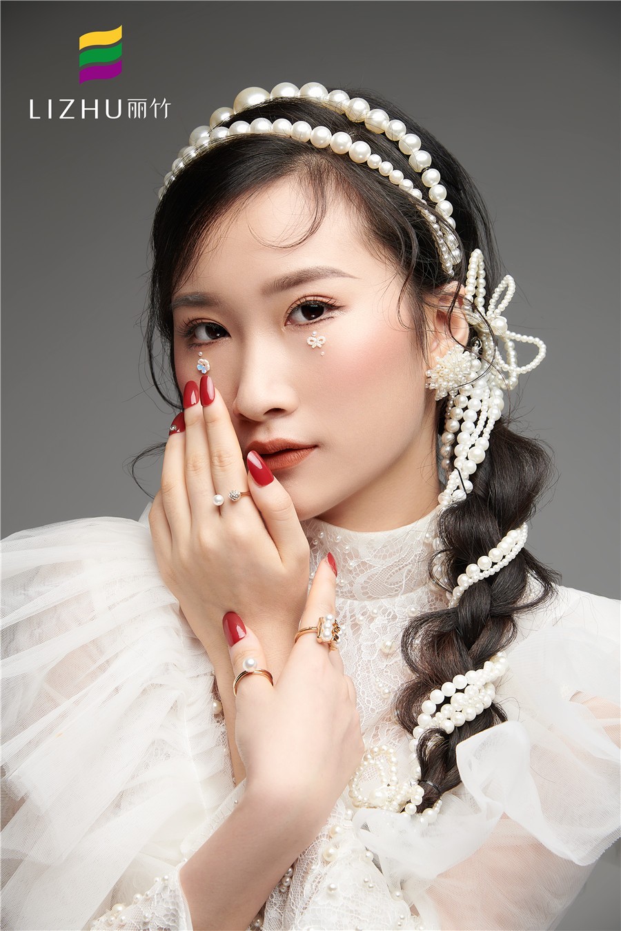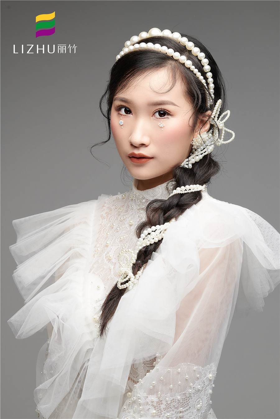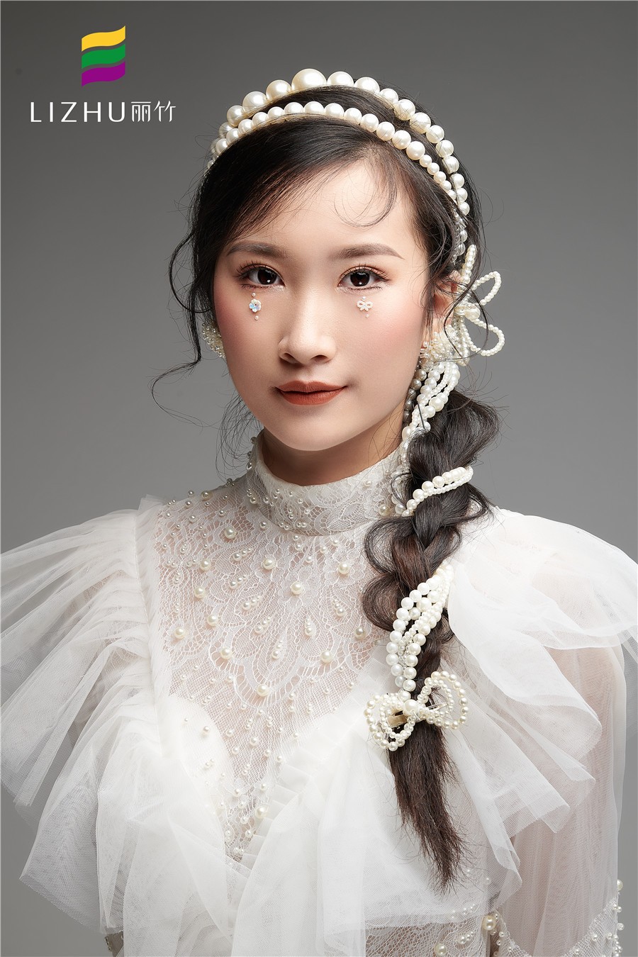 南寧彩妝培訓(xùn)(麗竹彩妝培訓(xùn))---簡約名媛妝容造型:氣質(zhì)溫柔大方的造型,結(jié)合優(yōu)雅珍珠發(fā)帶的編發(fā),增添了柔眉眼間的柔美。加上珍珠蕾絲禮服的加持,讓人不禁心生愛戀。