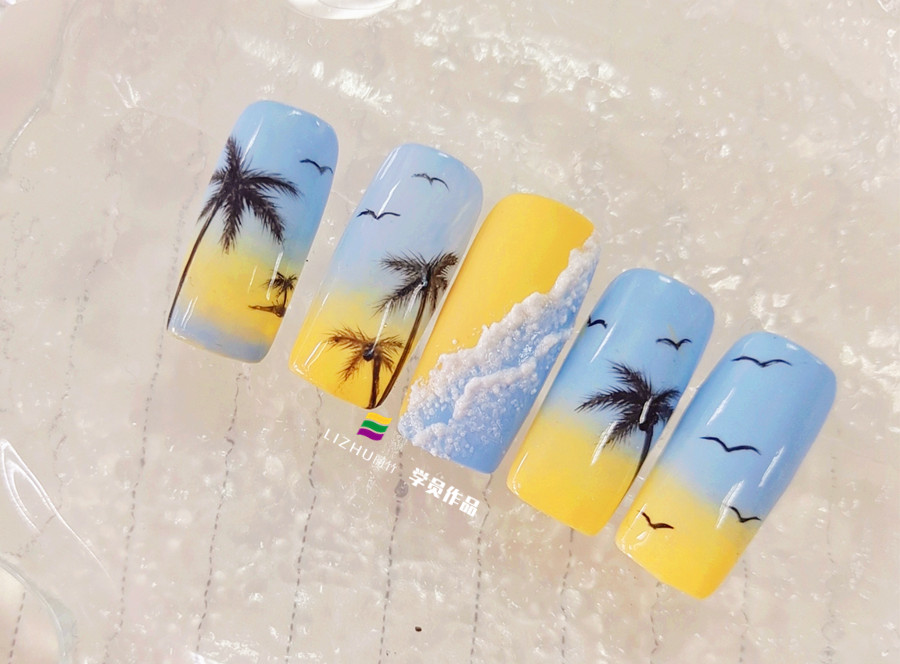 相信很少有人會(huì)不喜歡陽(yáng)光,沙灘,大海的吧!郁郁蔥蔥的椰子樹(shù)佇立在海邊,陽(yáng)光暖暖的照在細(xì)軟的沙灘上,沙子發(fā)出一閃一閃亮晶晶的光,仿佛一顆顆正在發(fā)光發(fā)亮的鉆石閃耀。俏皮的海星和貝殼沖上沙灘,給自己進(jìn)行了一場(chǎng)陽(yáng)光浴。高空飛翔的海鷗,則展開(kāi)雙臂,自由盤旋在海面上,與海浪盡情嬉戲,好一副碧海藍(lán)天的愜意景象!既然去不了海邊,那么就把海邊美景畫在你的“指”上吧!