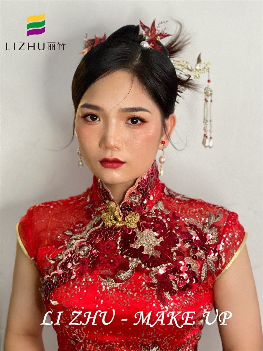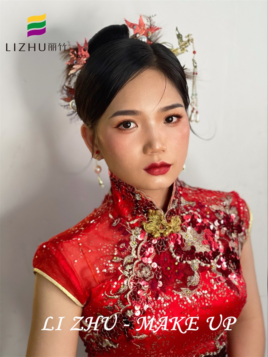 南寧新娘妝培訓(xùn)學(xué)校、南寧新娘妝教得好的培訓(xùn)、南寧新娘妝培訓(xùn)班作品---新娘敬酒造型:簡潔大方的高發(fā)髻盤發(fā),耳邊靈動(dòng)的抽絲碎發(fā),輪廓感極強(qiáng)的絹花發(fā)飾,配搭大氣優(yōu)雅的珍珠耳飾,與紅色亮片刺繡相互呼應(yīng),更能襯托新娘貴氣喜慶的氣質(zhì)。如果你也想在南寧學(xué)新娘妝,或是想知道南寧學(xué)新娘妝的學(xué)校有哪些?歡迎到麗竹學(xué)校參觀試聽。