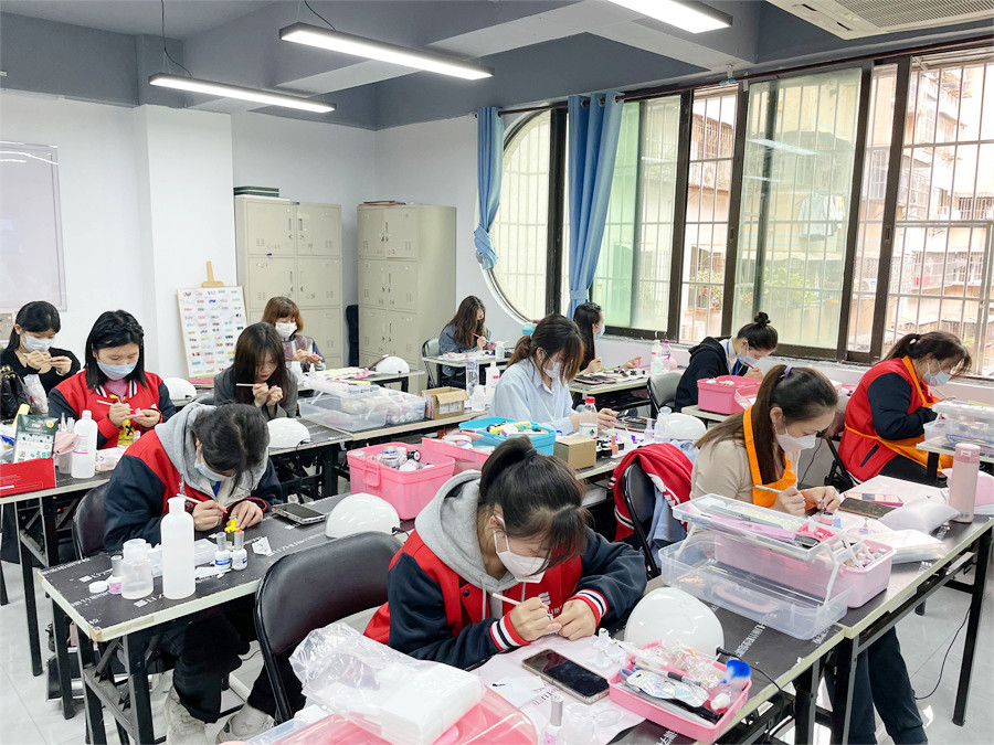 廣西美甲培訓(xùn)班學(xué)員課堂甲面繪制圖案練習(xí)