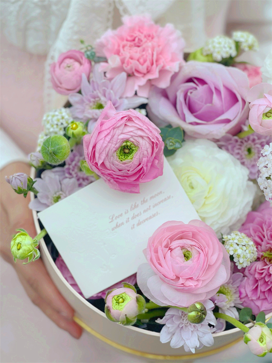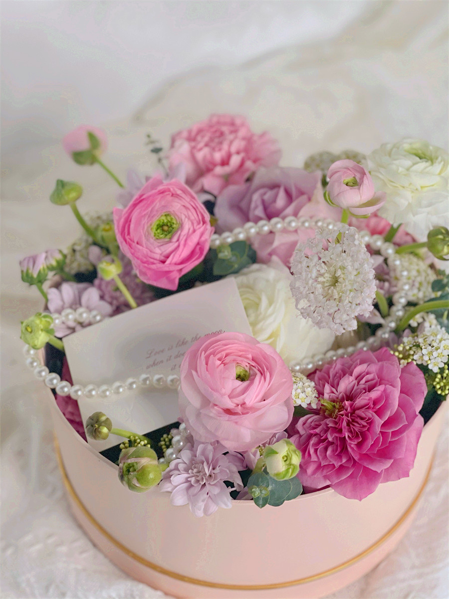 在制作韓式花盒時,花盒以及花材的色彩采用單色或同色系,即使選擇撞色的花材進行搭配,也要適中保持干凈整潔。在進行插花設計時,遵守風格自然,精致浪漫,配色清新,不局限于單一品種……這樣打造出來的花盒總能散發(fā)出一絲感性與溫暖的色彩。