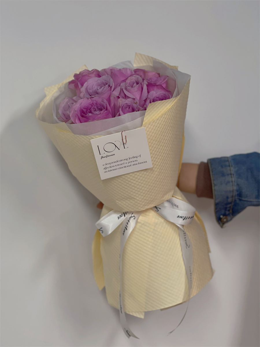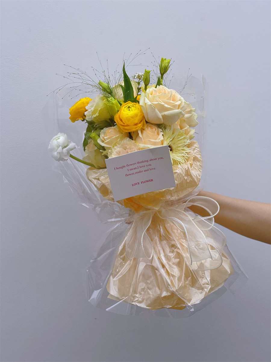 在進(jìn)行圓形花束的制作時,在確定主花后,便可以按照螺旋的方式一次添加花材,使得整束花看起來飽滿之后,稍作調(diào)整成為一個圓形的輪廓,然后便可以用繩子在根部綁好進(jìn)行修剪?;ú奶幚砗昧酥?,將包裝紙裁剪出適當(dāng)?shù)拇笮?,然后根?jù)花的形狀包裹起來,用彩帶幫緊并打成一個蝴蝶結(jié),這樣圓形小花束就完成了。
