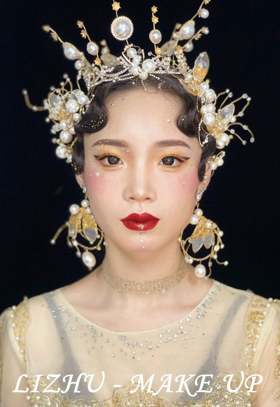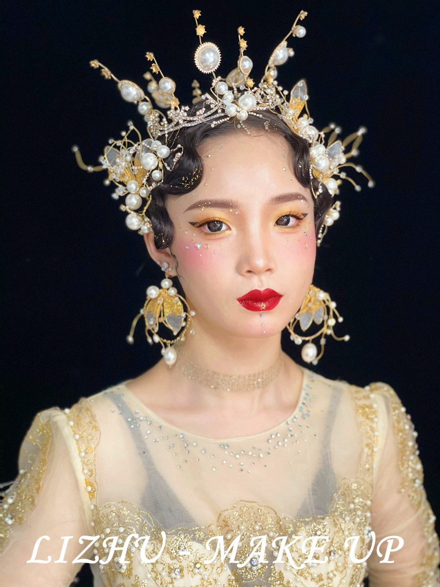 廣西彩妝創(chuàng)意培訓(xùn)學(xué)校作品欣賞:復(fù)古手推波高聳發(fā)髻,金黃高奢珍珠碎鉆發(fā)飾點(diǎn)綴,佩戴同款奢華大氣耳飾,烈焰紅唇襯托大氣底妝,金屬亮片飾品裝飾整臉妝容,身穿重工釘珠打造禮服,氣場(chǎng)強(qiáng)大的高奢妝容造型映入眼簾。