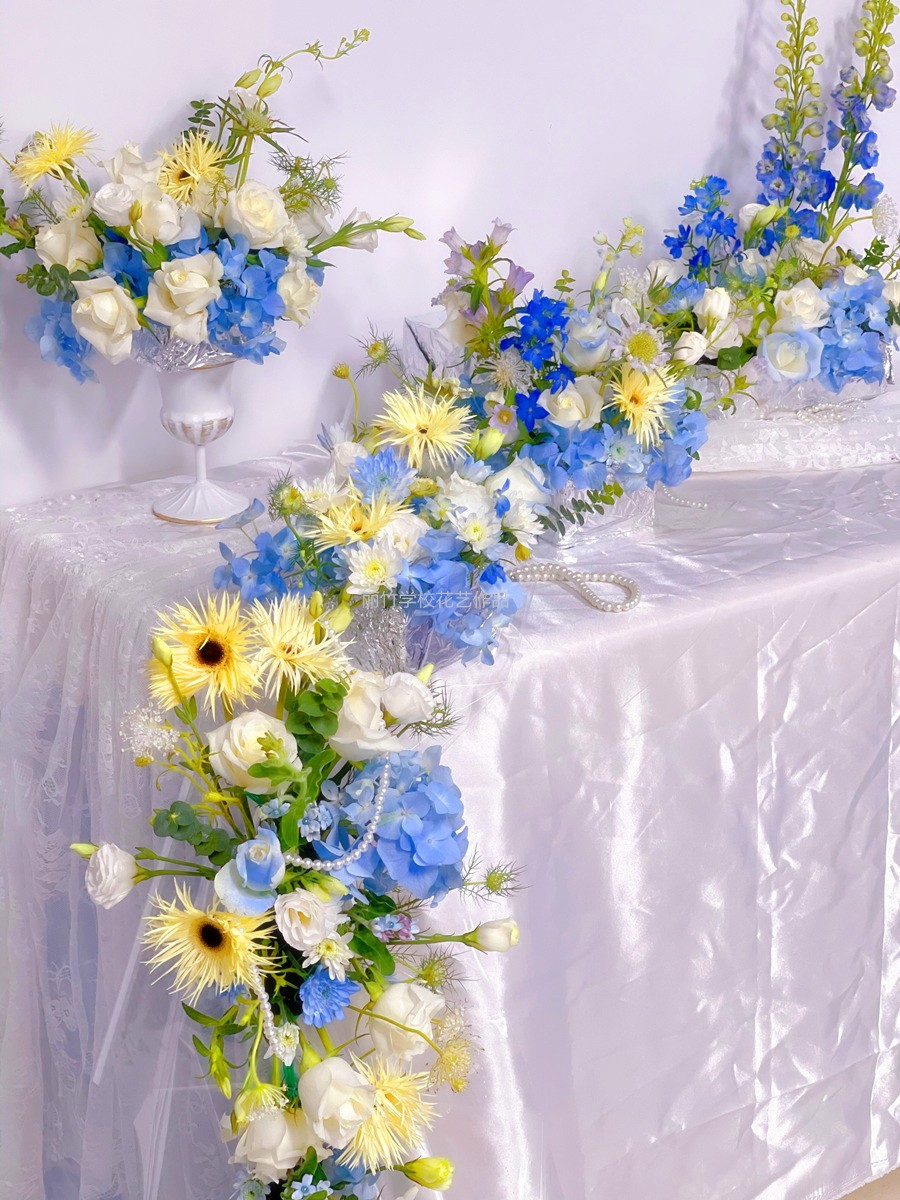 花藝插花專業(yè)教程---但如果采用的是西式長條桌,那么這種類型的桌花設計就更特別一些。一般會將話說串聯(lián)起來后,在桌面中間長長地鋪陳開來,并在桌子的兩頭會特意設計成瀑布桌花鏈接地面,營造浪味唯美的氛圍!