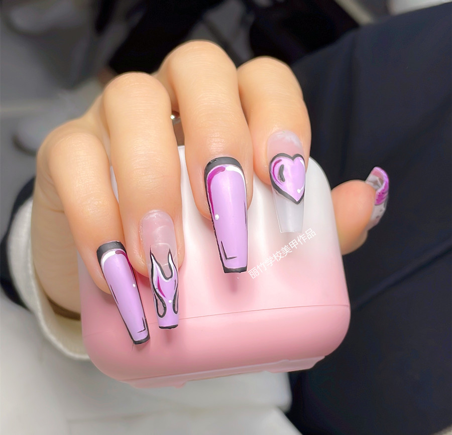 南寧專業(yè)美甲教學(xué)、南寧美甲技術(shù)培訓(xùn):當(dāng)彩繪技術(shù)與卡通形象相互結(jié)合時(shí),相信沒有哪個(gè)妹紙會不喜歡吧?下面,就和我們一起來看看南寧美甲師學(xué)校-麗竹美甲學(xué)校學(xué)員繪制紫色彩繪美甲。