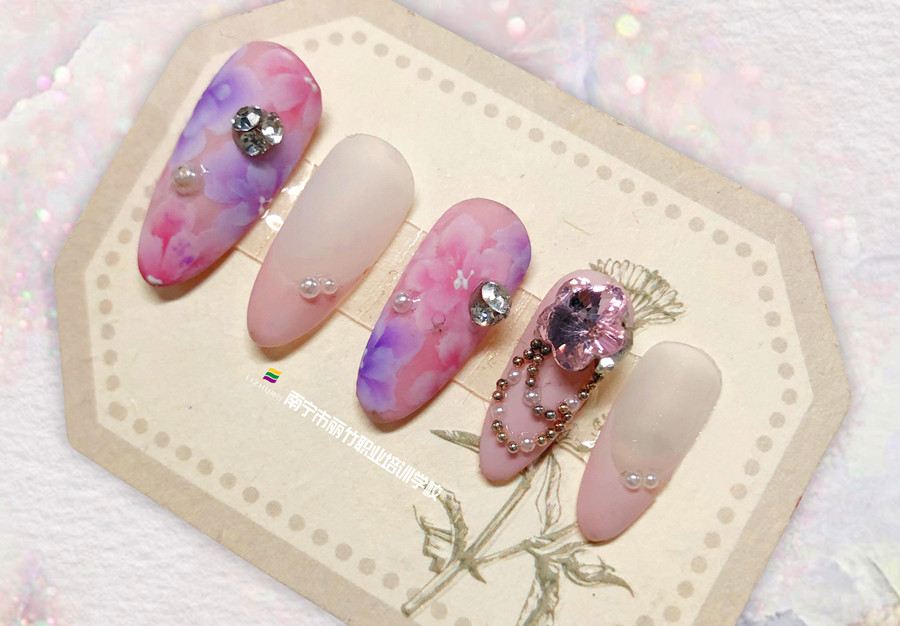 南寧美甲學習、南寧美甲師:花朵,也是美甲作品的常用元素之一。而在日常生活中,我們見到的花朵美甲技法大多采用單色或雙色漸變的方法進行描繪。在南寧美甲款式進修的課堂上,不妨和我們一起去看看南寧培訓美甲班里老師的制作的兩款南寧美甲店里南寧美甲學徒必學的暈染花朵美甲作品吧!