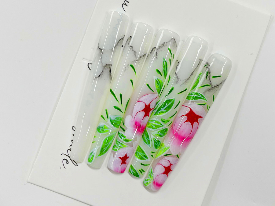 美甲技法:作品主要以為彩繪為主,暈染為輔。通過(guò)細(xì)膩的筆觸描繪出花紅柳綠,群山連綿的輪廓。在用暈染的方式打造出鮮花,群山相互交映的視覺(jué)上沖擊感,將一副上春山的美景印入眼前。