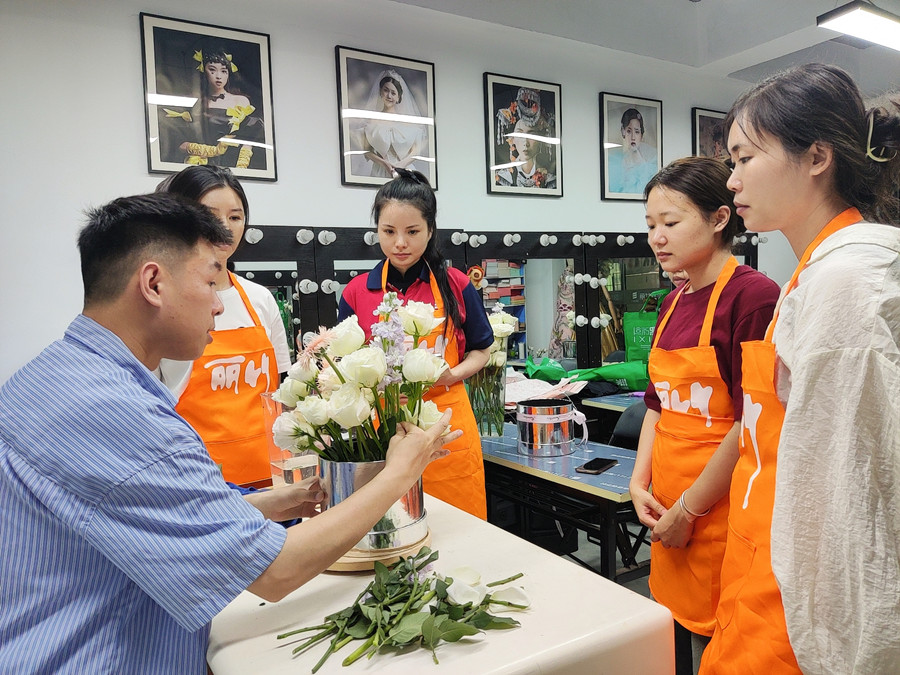 廣西婚慶花藝師、廣西花藝插花:廣西婚慶花藝設計培訓(麗竹婚慶花藝設計培訓)課堂的教室里,看看同學們練習玫瑰花抱抱桶的操作。而隨著作品的完成,廣西婚慶花藝學?!痘ㄋ嚵慊A課程》已經(jīng)浪漫結束。如果你也想像她們一樣用自己的雙手制作出蕞能表達你情感的花束,歡迎向麗竹學校咨詢《時尚婚慶花藝設計班》的課程,滿意之后在報名吧!