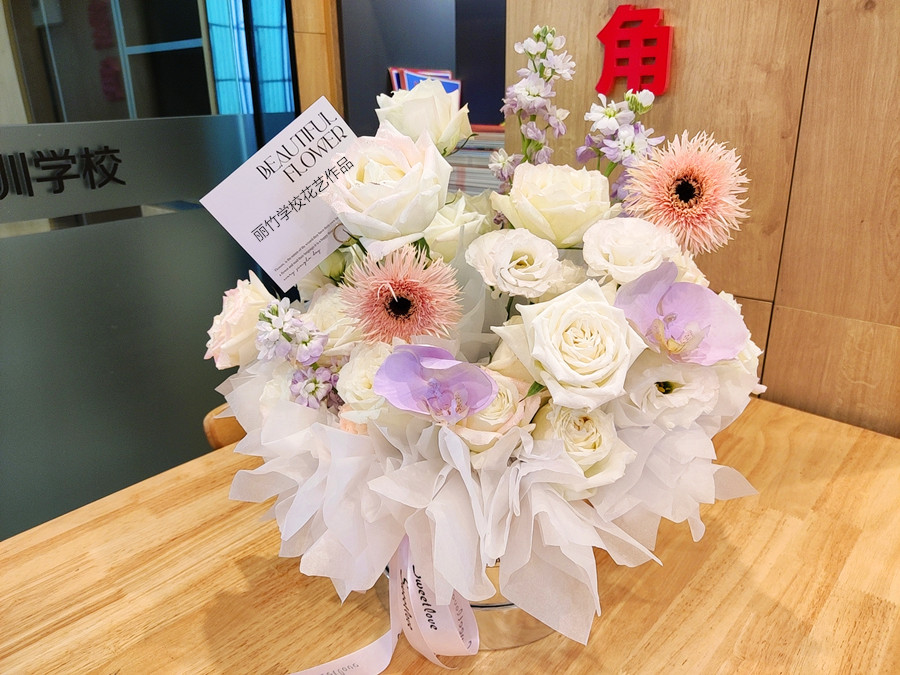看吧!在老師的指導下,還有同學們自己的努力下,一個清新養(yǎng)眼且浪漫十足的白色玫瑰花抱抱桶就完成啦!純白無瑕的花束下,代表了不摻雜任何瑕疵的愛情,想必收到這個花藝作品的女孩定會十分歡喜。