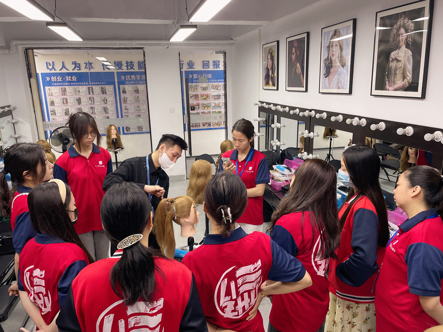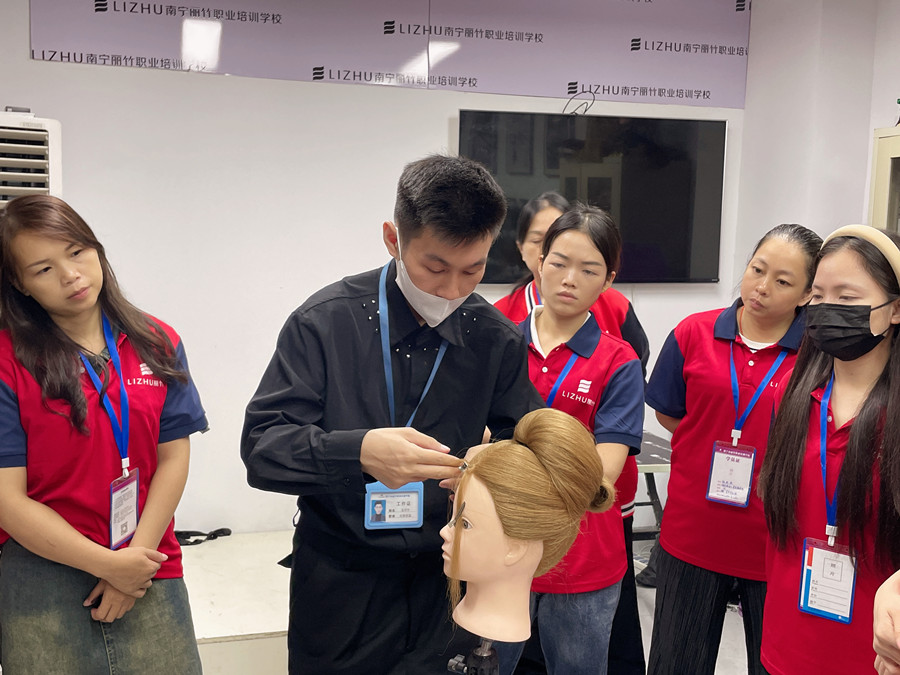 南寧化妝編發(fā)、南寧學(xué)盤發(fā):南寧化妝發(fā)型學(xué)校(麗竹化妝發(fā)型學(xué)校)就為大家演示下南寧專業(yè)化妝發(fā)型課程里關(guān)于赫本頭發(fā)型手法技巧的內(nèi)容。然后在采用倒梳的方法將頭發(fā)打成蓬松的狀態(tài),用手調(diào)整發(fā)型團(tuán)狀,并利用固定發(fā)夾將團(tuán)狀秀發(fā)牢牢固定在頭頂。之后用在將團(tuán)狀的發(fā)髻往兩邊撥弄成扇形展開,梳理四周頭發(fā)到服帖,用發(fā)膠固定好形狀即好。