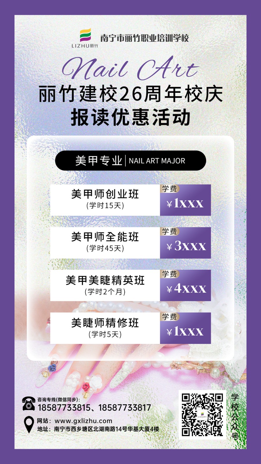 如果你喜愛美甲,想從事美甲行業(yè)的相關工作,但是不知道南寧美甲學校怎么報名?只要你對美甲感興趣,有一顆想學習的心,那千萬不要錯過麗竹學校正在進行的26周年校慶之“報讀優(yōu)惠活動”啦!歡迎關注麗竹學校了解更多課程詳情和活動信息。
