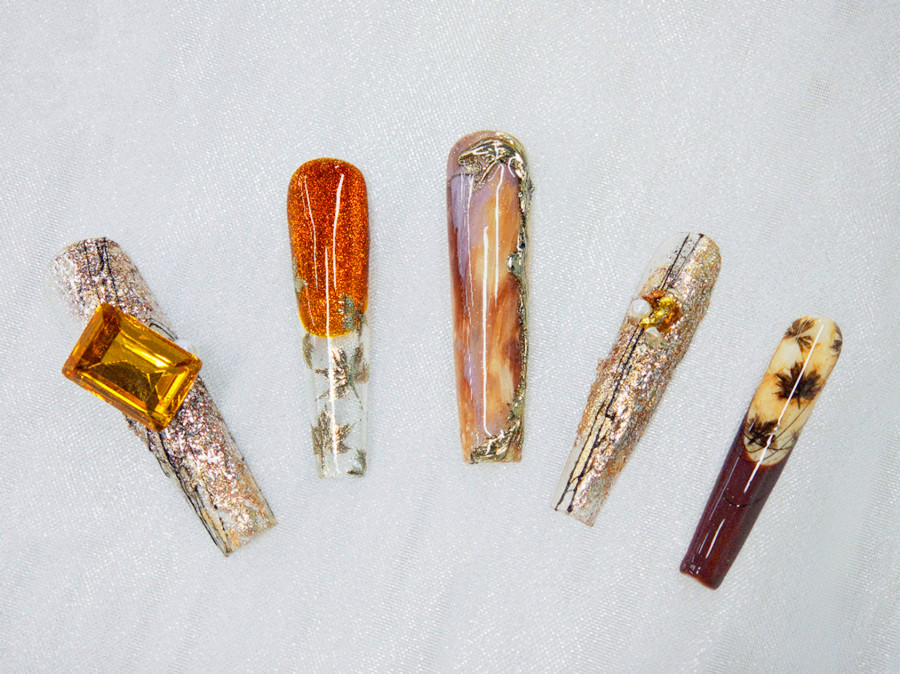 廣西美甲課堂實(shí)訓(xùn)、廣西美甲培訓(xùn)實(shí)操:整副作品主要是以暈染技術(shù)和水晶砂礫共同打造而成。以透明底作為底色,用暈染液打造出的琥珀色的圖案營(yíng)造出夕陽(yáng)的氛圍感。再用水晶砂和金箔紙繪制出楓葉,暈染出落日般的晚霞,整體視覺(jué)營(yíng)造出了一種非常低調(diào)、優(yōu)雅、夢(mèng)幻的精致感。