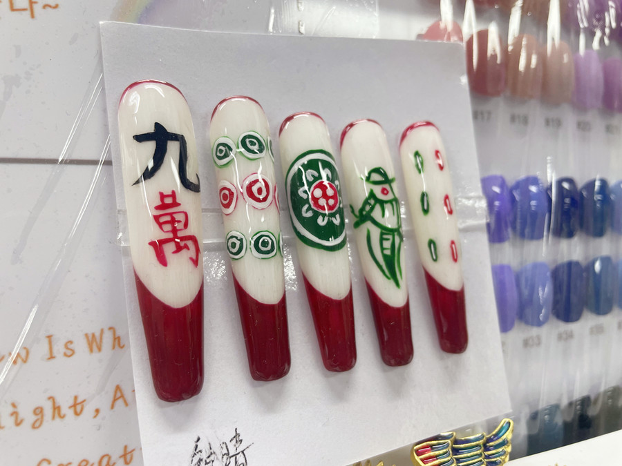南寧美甲訓練、南寧美甲作品:面對成千上萬款美甲,身為美甲控的你想好給自己做什么款式的美甲了么?如果還沒有,南寧美甲職業(yè)學校推薦你可以可以試試南寧美甲造型進修班同學們繪制的畢業(yè)作品。這便是新年里建議大家一定要嘗試做的美甲款式---麻將美甲。