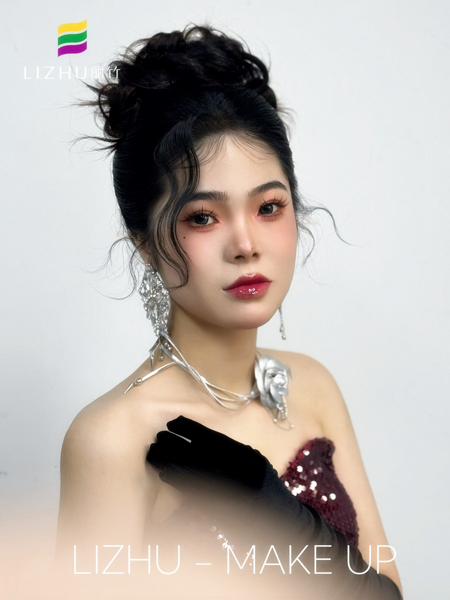 廣西彩妝化妝寫真、廣西化妝高彩、廣西學(xué)彩妝造型影樓(麗竹彩妝化妝學(xué)校)作品---千金禮服造型:極具質(zhì)感的妝容打造,蓬松自然高顱頂盤發(fā),銀色飾品的裝飾點(diǎn)綴,輕松拿捏豪門千金感!