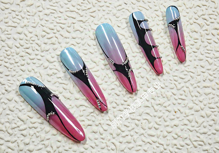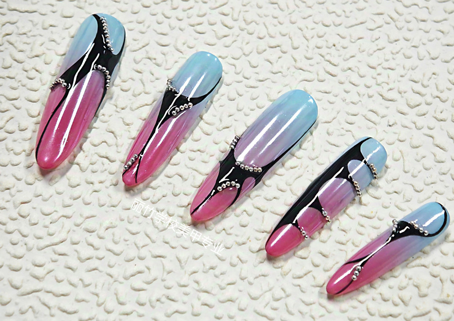 廣西美甲學院、廣西美甲中心:當多層暈染漸變碰上靈動線條,在配上圓形小鋼珠做點綴,你能想象得出會它們?nèi)咧g會擦出什么火花嗎?如果你暫時還沒想好,不如先來看看廣西美甲深造培訓班(麗竹美甲進修學校)繪制的作品--- 漸變線條美甲。