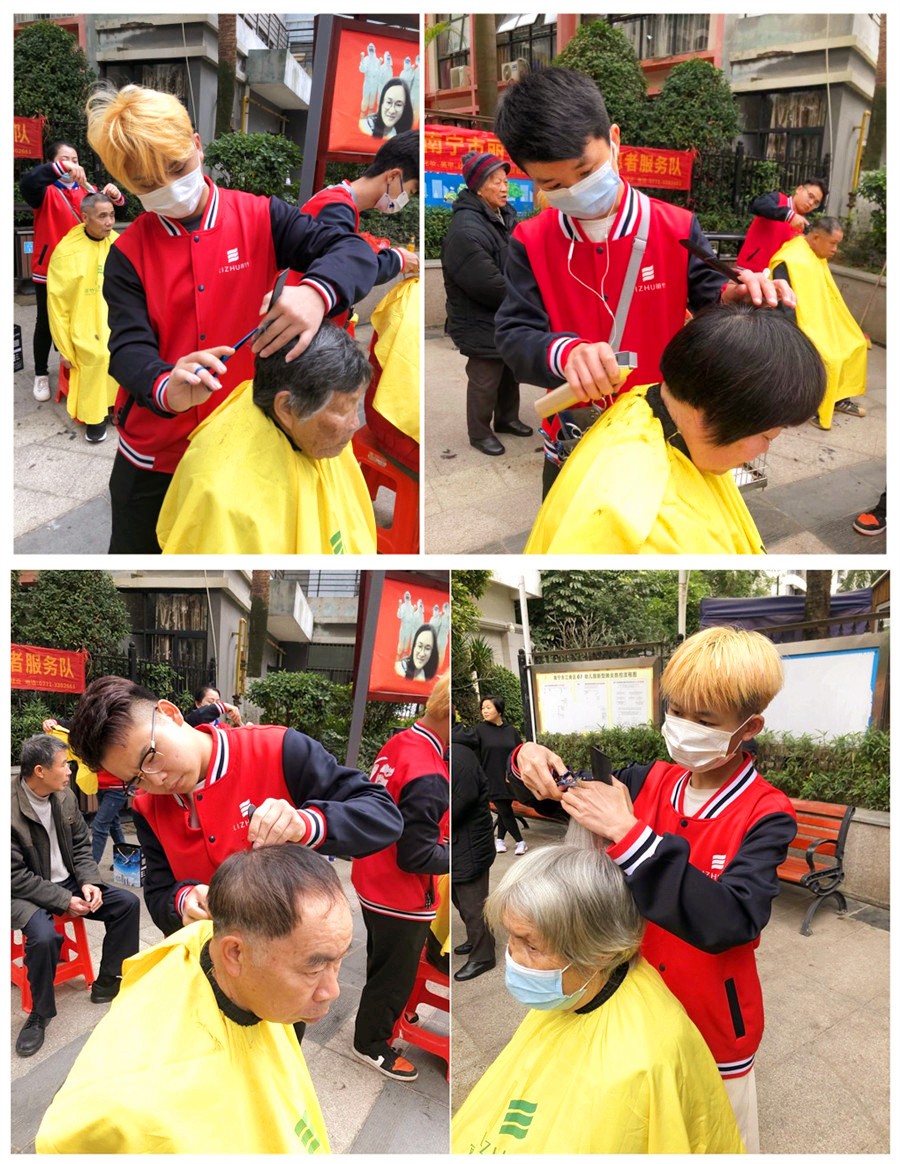 不一會(huì),居民們就陸續(xù)從四面八方而來。學(xué)員們有序帶領(lǐng)居民們坐下后,便開始細(xì)心詢問大家的理發(fā)需求,之后理發(fā)工作便開始了!在學(xué)員們嫻熟的操作下,不會(huì)以一個(gè)清爽利落的發(fā)型便完成了。居民們看著自己的新發(fā)型,紛紛向?qū)W員們豎起了大拇指!