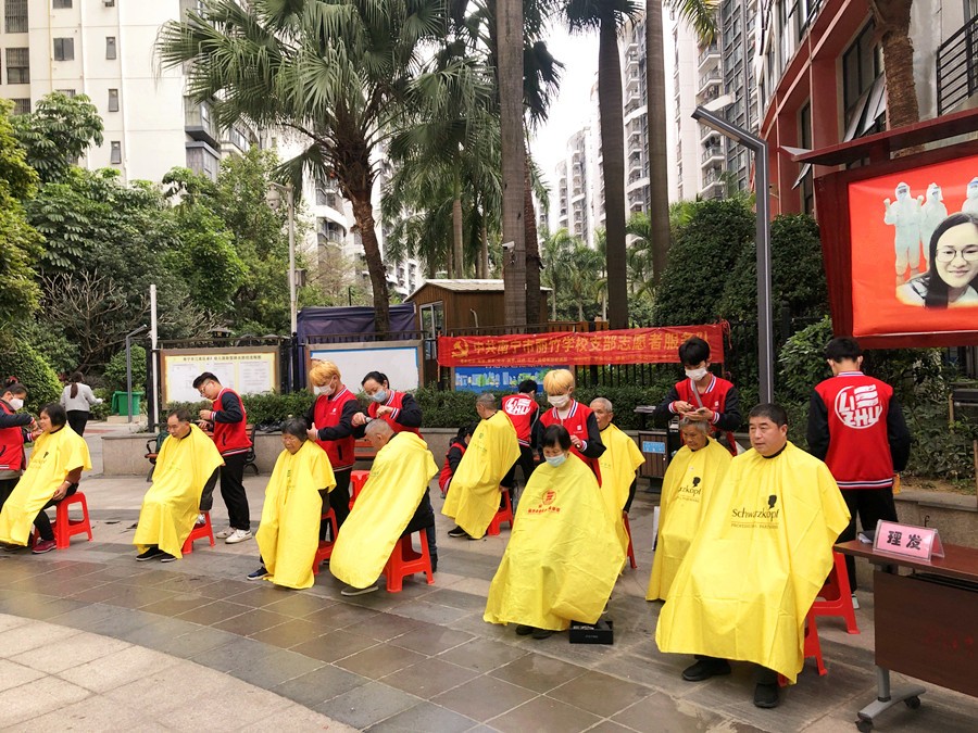 廣西南寧美發(fā)學(xué)校實(shí)踐教學(xué)、廣西美發(fā)學(xué)校實(shí)訓(xùn)分享:初春早上攜帶而來的涼意,讓人們不僅打了個(gè)寒顫。但在江南華府的中心花園里,廣西美發(fā)師培訓(xùn)學(xué)校-麗竹美發(fā)學(xué)校志愿者服務(wù)隊(duì)的學(xué)員們?cè)缫褜⒌首?,美發(fā)工具擺放好,熱情高漲地等待居民的到來為他們提供免費(fèi)理發(fā)活動(dòng)!