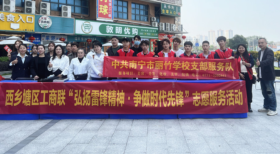 中共南寧市麗竹學(xué)校支部服務(wù)隊(duì),積極響應(yīng)在石埠街西明商業(yè)廣場舉行的南寧市西鄉(xiāng)塘區(qū)工商聯(lián)“弘揚(yáng)雷鋒精神·爭做時(shí)代先鋒”活動(dòng),為群眾提供義剪服務(wù)。