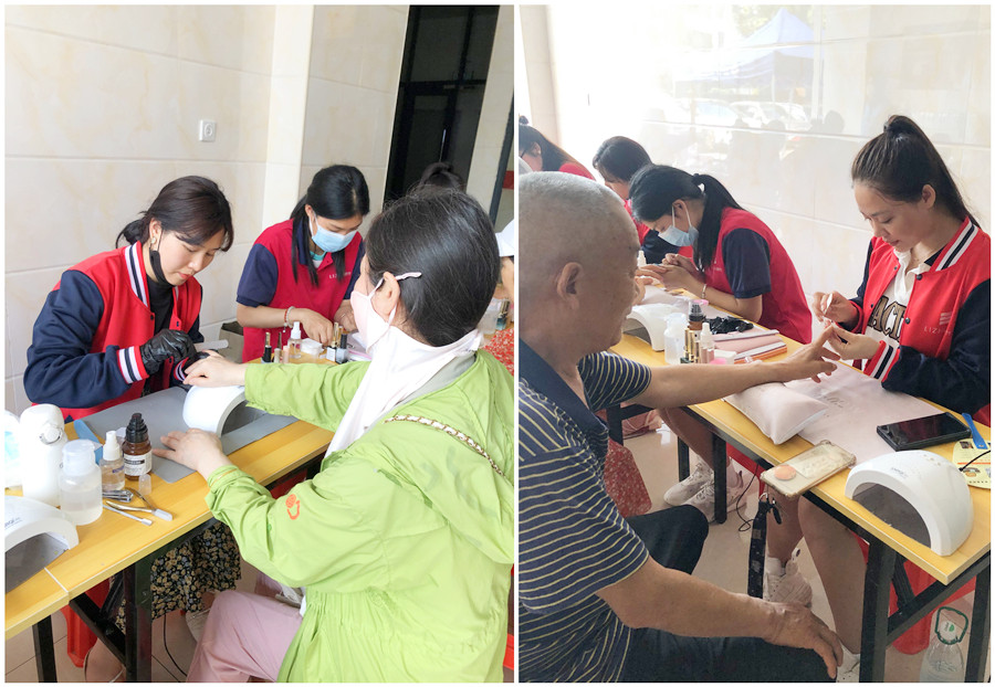 活動現場,雖然來的都是叔叔阿姨,爺爺奶奶,但愛美之心人皆有之。同學們每操作一個步驟,都會很耐心地為大家進行解釋。即使現場條件有限,但同學們還是認真地為大家修剪死皮,打磨甲形,拋光甲面,涂抹單色等項目。而居民也用手機記錄下了這次難得的美甲體驗,現場氣氛十分熱烈。