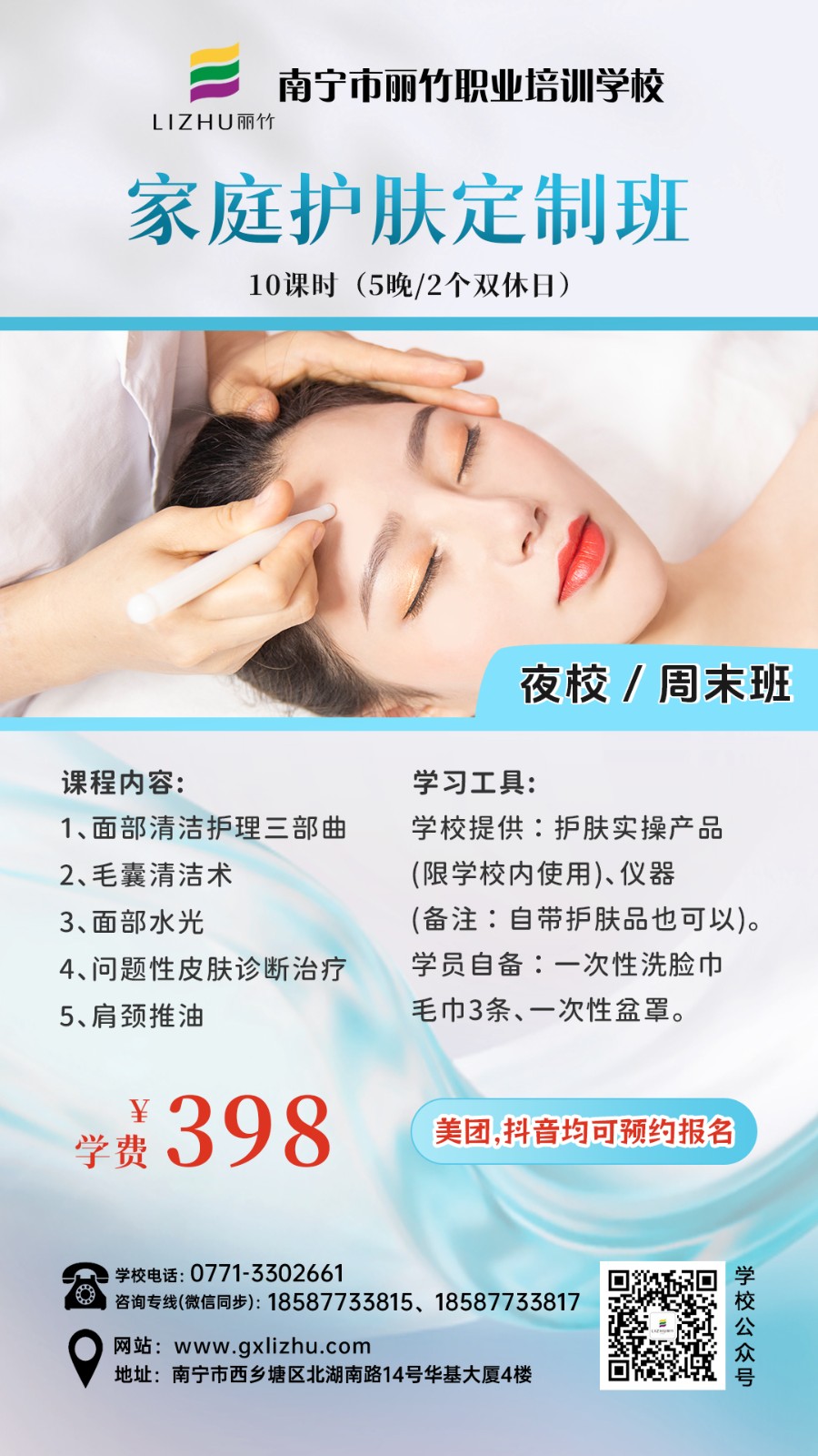南寧美業(yè)技術(shù)培訓(xùn)學(xué)校-麗竹學(xué)校特色課程推薦---夜班/周末班,來(lái)咯![慶祝][太陽(yáng)]無(wú)論你是上班族,寶媽,自由從業(yè)者……無(wú)論你想周末上課,還是上晚課,統(tǒng)統(tǒng)都由你說(shuō)了算!!