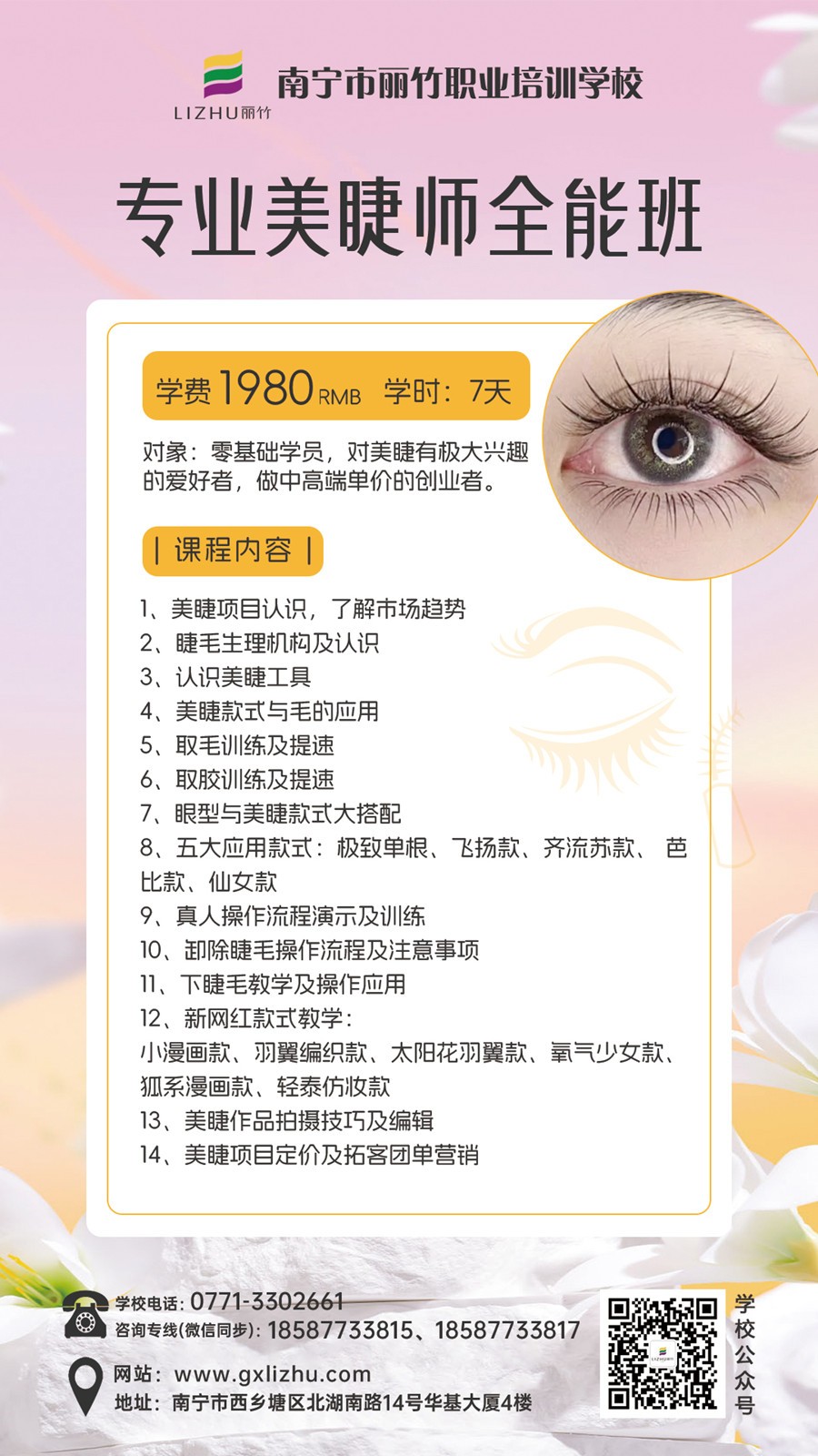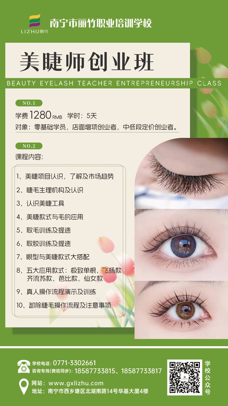 南寧美睫師、零基礎學美睫:寧美睫培訓學校-麗竹學校美睫課程教學技術成功全面升級!美睫學費優(yōu)惠活動持續(xù)進行,截止日期為5月30日。如果你想在南寧學美睫,想做南寧美睫培訓學費哪里便宜?那現(xiàn)在就不要猶豫,趕緊聯(lián)系我們報名吧!拼手速的時候就是現(xiàn)在。畢竟,你還在猶豫不決時,別人已經開始行動了。